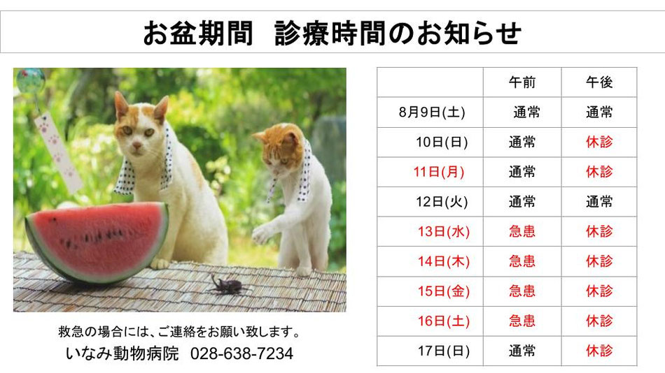 8月13日〜8月16日は夏季休暇のため通常診療をお休みさせていただきます。